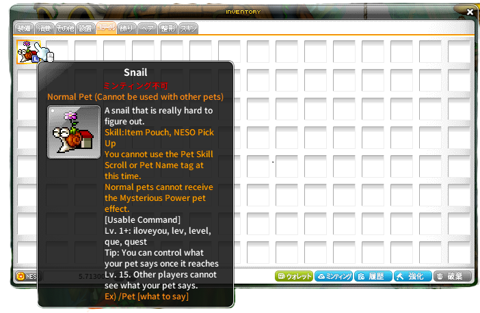 クエスト完了後、アイテムインベントリを開き、上部メニューの「ユティル」タブを選択すると「Snail」というペットが入っています。