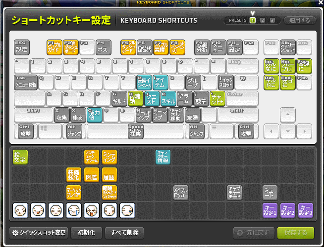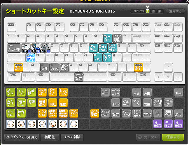 - A~Hキー … 攻撃スキル(職業に応じてよく使うスキルを並べる)